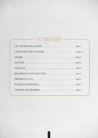 SOMMAIRE LES ENTRÉES DE LA MER LES ENTRÉES DE LA TERRE CAVIAR HUITRES VOLAILLE BOUDINS & PLATS FESTIVES FROMAGES & CO PLATEAUX FROMAGES ÉPICERIE GOURMANDE 4